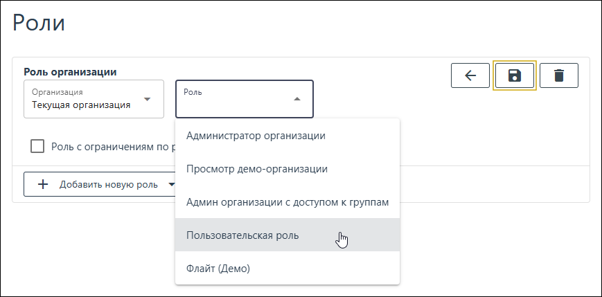 Добавить новую роль» с выпадающим списком и выберите вариант «Роль организации».