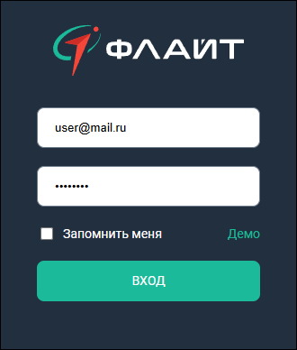 Введите логин и пароль от учетной записи на странице авторизации и нажмите кнопку «Вход». Если перед нажатием кнопки «Вход» установить чек-бокс «Запомнить меня», то при последующих переходах в систему Флайт авторизация с введенными данными будет проходить автоматически (чтобы снять чек-бокс, выйдите из учетной записи через меню пользователя).