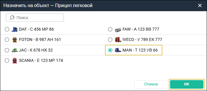 в строке того прицепа, который требуется назначить на объект мониторинга.