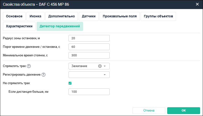 На вкладке «Детектор передвижений» можно задать настройки критериев определения остановок и стоянок, а также параметры коррекции трека и регистрации движения объекта мониторинга.