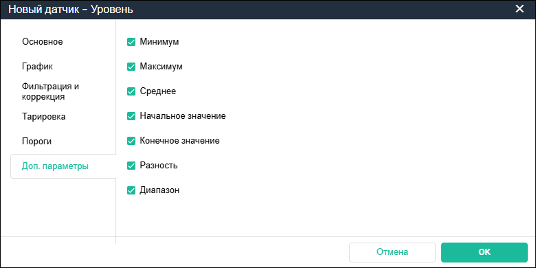 Установите чек-боксы для дополнительных параметров, которые будут вычисляться для датчика уровня за интервалы времени и отображаться в списках рейсов и событий на вкладке «Рейсы», а также в отчетах.