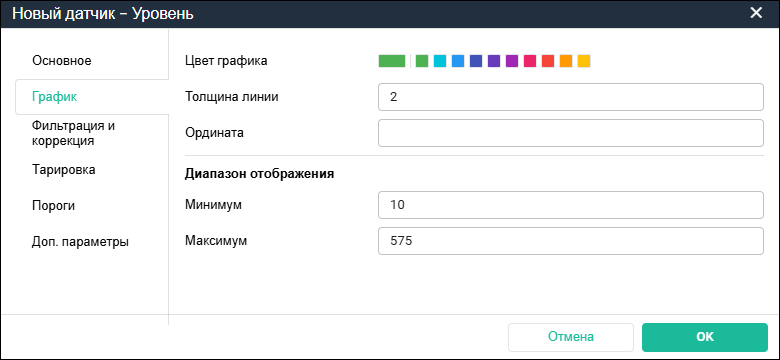Задайте настройки отображения данных датчика уровня на графиках вкладки «Сообщения»: