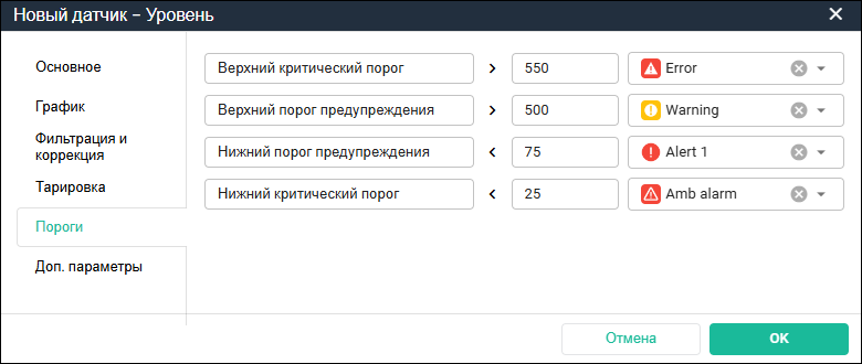 Всего в системе предусмотрено четыре порога: верхний критический, верхний предупреждения, нижний предупреждения и нижний критический. Для того чтобы порог обрабатывался, укажите для него значение уровня и выберите иконку. Дополнительно можно изменить описание порога, установленное по умолчанию.