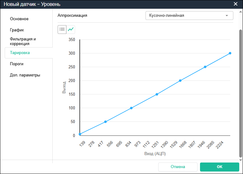 - Выберите в выпадающем списке «Аппроксимация» тип аппроксимации для тарировочной таблицы.