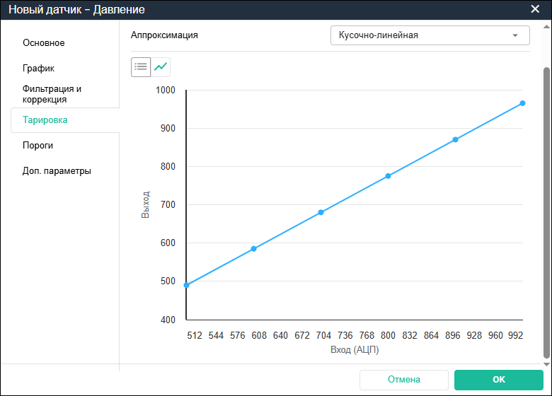 - Выберите в выпадающем списке «Аппроксимация» тип аппроксимации для тарировочной таблицы.