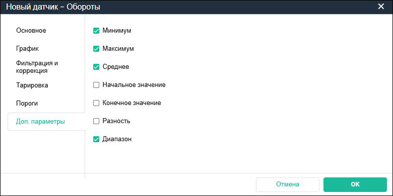 Установите чек-боксы для дополнительных параметров, которые будут вычисляться для датчика оборотов за интервалы времени и отображаться в списках рейсов и событий на вкладке «Рейсы», а также в отчетах.