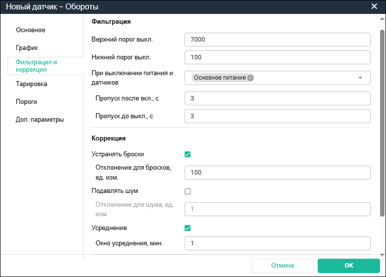 - Укажите в поле «Нижний порог выкл.» минимальное значение оборотов. Любые значения меньше указанного минимального будут отфильтрованы и не будут участвовать в обработке данных.