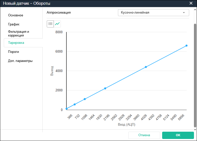 Создайте новую тарировочную таблицу или импортируйте готовую таблицу из файла. По этой тарировочной таблице будет производиться пересчет значений оборотов, полученных в результате фильтрации.