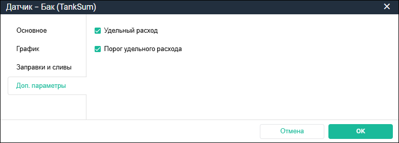 - установите чек-бокс «Доп. пороги по датчику» и выберите в выпадающем списке «Датчик» датчик дополнительного потребителя (может быть выбрана либо запись устройства мониторинга, по которой будет определяться состояние датчика, либо один из имеющихся у объекта мониторинга датчиков);