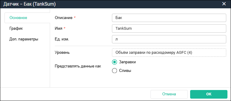 - Выберите расходомер (ТРК) или один из имеющихся у объекта мониторинга датчиков уровня топлива и датчиков прочих уровней.