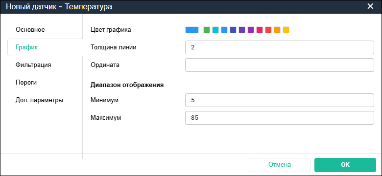 Задайте настройки отображения данных датчика температуры на графиках вкладки «Сообщения»: