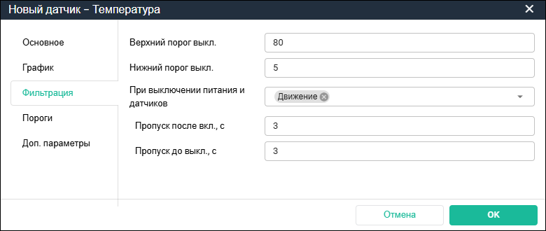 - Выберите в выпадающем списке «При выключении питания и датчиков» параметры питания или датчики объекта мониторинга, при выключении которых значения температуры будут фильтроваться. Если выбрано несколько параметров или датчиков, то значения будут фильтроваться при выключении хотя бы одного из них.