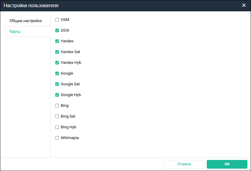 На вкладке «Карты» можно установить чек-боксы для тех источников географических карт, которые будут доступны для выбора в меню инструментов карты.